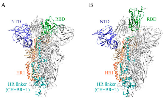 Schematic representation of SARS-CoV-2 S protein in (A) closed state (Sclosed, PDB ID: 7DDD) and (B) open state (Sopen, PDB ID: 7DDN). N-terminal domain (NTD), receptor-binding domain (RBD), heptad repeat1 (HR1), and HR linker were colored by blue, green, coral, and dark cyan, respectively.