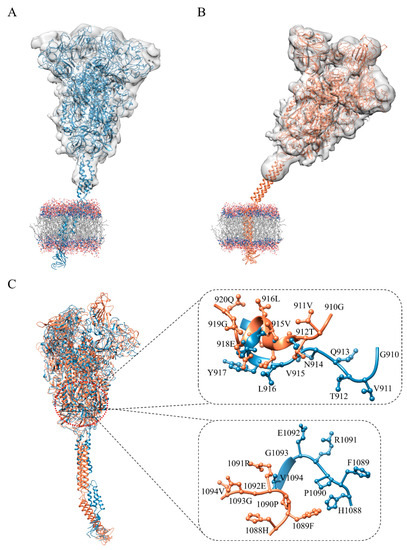 The structures of in situ S trimer in the closed (Sclosed, A) and open states (Sopen, B), and the structure differences of the sequence 910–920 in the HR1 domain and sequence 1088–1094 in the HR linker between Sclosed and Sopen structures (C). TM domain of S trimer was embedded into the bilayer membrane (molar ratio of POPC:cholesterol = 9:1) with the EM density maps fitting. The Sclosed and Sopen structures were respectively colored by blue and coral.