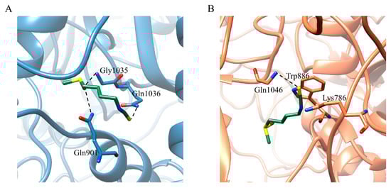 SFN has H-bonding interactions with residues Gly901, Gly1035, and Gln1036 of C chain (Gly901/C, Gly1035/C and Gln1036/C) in the SFN-Sclosed complex (Figure 3A). Isometheptene and Allicin bind S by the hydrophobic interactions with Arg685/A, and Val781/C, Ala1025/C, and Ala1026/C (Figure S3A,D). The carboxyl of urocanic acid forms the hydrogen bond with Thr874/C (Figure S3B). The hydroxyl of 1-octanol has the H-bonding interaction with Arg685/A, and 1-octanol forms hydrophobic interactions with Tyr873/C, Pro1053/C, and Val1060/C (Figure S3C). Regarding the Sopen in complexes with five potential agents, SFN has the H-bonding interaction with residue Gln1046/B, electrostatic interactions with residues Lys786/C and Trp886/C (Figure 3B). Isometheptene only has the hydrophobic interactions with hydrophobic residues Val729/A, 781/A, 785/A, 1060/A, Ty873/A, and Ala1025/A, 1026/A, wherein the Val781/A, Ala1025/A, and Ala1026/A are involved in the hydrophobic effects of isometheptene-Sclosed complex (Figure S4A). Residues Ala684–Val687/A and Val785/B, Leu877/B, Leu1034/B are responsible for the binding between Sclosed and two ligands urocanic acid, 1-octanol. The atom O of both ligands possesses the H-bonding interactions with residue Ser686/A and the two ligands also form the hydrophobic interactions with Leu877/B and Leu1034/B (Figure S4B,C). Allicin has the H-bonding interactions with residues Ser704/B and Thr887/C and exits the hydrophobic interactions with residues Pro1069 and Val1094 (Figure S4D).