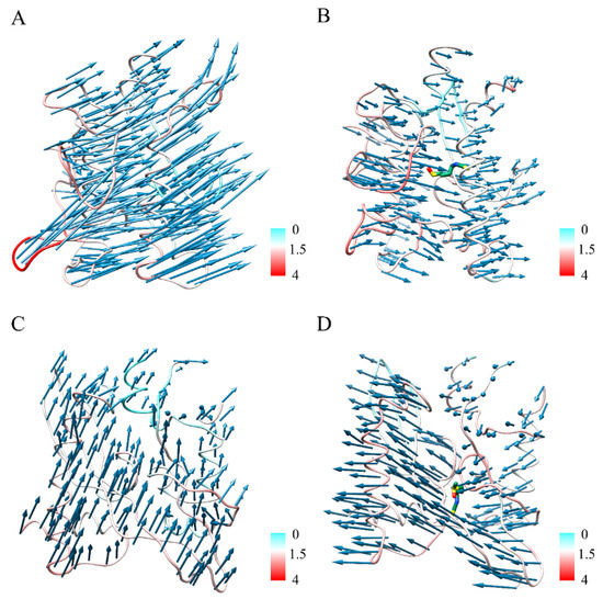 Vector field representations of the first principal component (PC) obtained in the (A) Sclosed, (B) SFN-Sclosed, (C) Sopen, and (D) SFN-Sopen systems. The colors of the residues indicate the root-mean-square fluctuation (RMSF) values (units in Å).