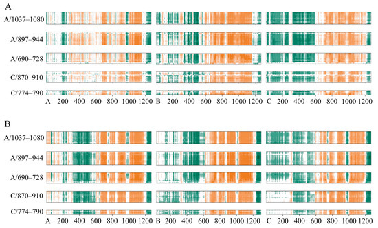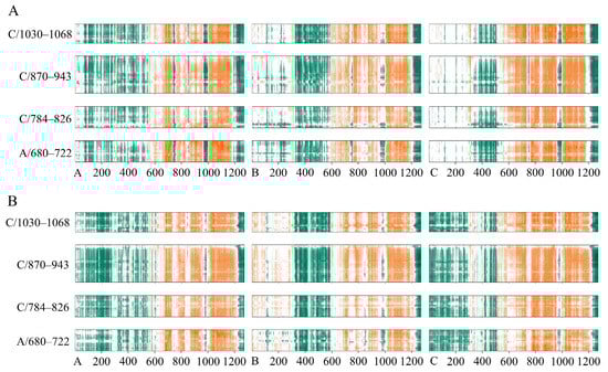 The structural dynamics of Sclosed and Sopen induced by SFN were further analyzed by the dynamic cross-correlation map or matrix (DCCM). In the DCCM plot, orange indicates significant positive correlation, dark green indicates obvious anti-correlation, while white regions indicate less correlation. For the convenience of analysis, only the correlations of residues Ser680–Val722/A, Gln784–Val826/C, Ile870–Ser943/C, and Ser1030–Val1068/C near the binding pocket of Sclosed are shown. The binding of SFN to Sclosed enhanced the anti-correlation of residues within the NTD regions of the A, especially C chains, and the anti-correlation with NTD region of B chain changed to positive correlation. SFN weakened the anti-correlation of residues near the binding pocket within RBD regions (331–527) of A and C chains. The extent of the anti-correlation between residues in the binding pocket and residues 970–998 located in the HR1 and CH regions of three chains was reduced by the binding of SFN. The degree of positive correlation of residues in the binding pocket with HR linker region and some amino acids in HR2 (1015–1188) of C chain was slightly weakened, probably due to the H-bonding interactions of SFN with Sclosed stabilizing this region (Figure 6A,B). We analyzed the correlations of the residues Gln774–Lys790/C, Ile870–Gly910/C, Gln690–Pro728/A, Pro897–Ala944/A, and Ser1037–Ala1080/A with the Sopen. The green region showed the anti-correlation between regions near FP (774–790) and sTM (870–910) with NTD, which is attenuated or even disappeared of the C chain. The RBD regions of A and B chain had strong anti-correlation values with the binding pocket region following the regulation of SFN and the correlation of the A chain was flipped, while the negative correlation between these two amino acid segments of C chain with RBD up was instead diminished. Obviously, the binding pocket shows enhanced positive correlation with most of the structures of S2, including FP, HR1, and HR2 in the three chains, but a significant negative correlation with the partial amino acids (978–1005) of HR1 and CH of C chain (Figure 7A,B). The RBD upward is necessary for S trimer binding to the cellular receptors for membrane fusion. SFN alters the dynamic cross-correlation of Sopen, especially the binding pocket and the region responsible for the extension of the structural transition from prefusion to postfusion, which may inhibit the conformational changes of Sopen and suppress the interaction of FP and TM with the membrane [48].