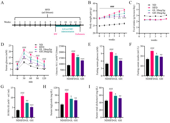 6-Gingerol improves disorders of glycolipid metabolism in high-fat diet (HFD)-fed mice. (A) Procedures for animal experiments. (B) Body weight gain and (C) food intake during administration. (D) Oral glucose tolerance test (OGTT) curve and the average area under the curve (AUC) after 4 weeks of administration with 6-gingerol. (E) Fasting serum glucose levels, (F) fasting serum insulin levels, (G) Homeostatic model assessment for insulin resistance (HOMA-IR), (H) serum triglyceride (TG) and (I) serum total cholesterol (TC) at the end of the experiments. Data were presented as mean ± SEM (n = 6 per group). ### p < 0.001 compared with the ND group; * p < 0.05, ** p < 0.01, *** p < 0.001 compared with the HFD group.