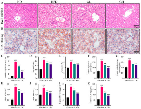 Hematoxylin and eosin (H&E) staining showed that large amounts of steatotic vacuoles and inflammatory foci were observed in the liver of the HFD group mice, and 6-gingerol exerted an alleviative effect on this pathological state (Figure 2A). Oil Red O (ORO) staining showed that numerous varying sizes of lipid droplets were deposited in the liver of the HFD group mice. However, the volume and amount of lipid droplets were remarkably reduced by 6-gingerol (Figure 2B,C). Additionally, the liver weight and liver index (ratio of liver weight to body weight) were both increased in the HFD group mice relative to the ND group mice, which were significantly reduced by 6-gingerol, especially by high-dose 6-gingerol (Figure 2D,E). Consistent with the alleviation of lipid droplets as shown in ORO staining, 6-gingerol also significantly subdued the HFD-elevated hepatic TG and TC levels (Figure 2F,G). In addition, serum alanine transaminase (ALT) and aspartate transaminase (AST), as liver injury markers, were obviously increased in the HFD group mice liver, whereas 6-gingerol significantly inhibited the elevation of ALT and AST levels (Figure 2H,I). The HFD group mice had higher hepatic concentrations of TNF-α and IL-6 protein compared to the ND group, while the hepatic inflammatory cytokines in both the GL and GH group mice were lower than those in the HFD group mice (Figure 2J,K). Collectively, these data suggest that 6-gingerol attenuates hepatic steatosis and inflammation in HFD-fed mice.