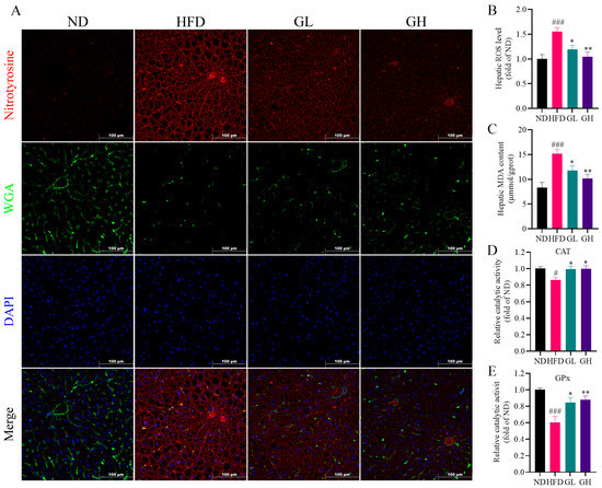 Immunofluorescence analysis for nitro-tyrosine was used to detect the hepatic endogenous RNS level, and WGA was used to mark the hepatocyte membranes. Briefly, liver frozen sections were permeated by 0.1% Triton X-100, followed by being blocked with 10% goat serum at RT for 1 h. Then, the sections were incubated with anti-nitro-tyrosine (1:200) and an anti-WGA (1:400) primary antibody at 4 °C overnight, followed with incubation with Dylight549-conjugated goat anti-rabbit IgG (#A23320, Abbkine, Wuhan, China) at RT for 1 h. The nuclei were then stained with DAPI and the slides were observed under a fluorescence microscope (Leica, Bensheim, Germany). An amount of 10% fresh liver homogenate was prepared in ice-cold phosphate-buffered saline (PBS). Subsequently, hepatic MDA (A003-1) contents, enzymatic activity of hepatic CAT (A007-1-1) and GPx (A005-1) were detected using corresponding commercial test kits (Nanjing Jiancheng Bioengineering Institute, Nanjing, China). Hepatic ROS levels were detected using a tissue ROS detection kit (#HR8821) obtained from Baiaolaibo Company (Beijing, China). All detections were performed according to the manufacturers’ instructions.