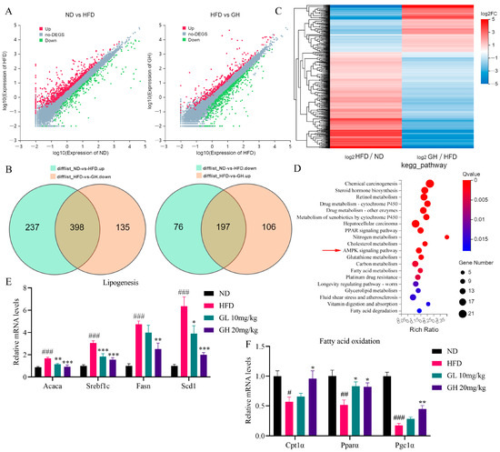 RNA-Seq and qRT-PCR analysis reveals the effects of 6-Gingerol on metabolism-related gene expression in the liver of HFD-fed mice. (A) Scatter plot of upregulated and downregulated differentially expressed genes (DEGs) in ND vs HFD and HFD vs GH. (B) Venn diagram of the overlapped DEGs between ND vs HFD and HFD vs GH. (C) Heat map for hierarchical cluster analysis of DEGs. (D) KEGG pathway enrichment analysis for DEGs. (E) Relative gene expressions of hepatic Acaca, Srebf1, Fasn and Scd1 by qRT-PCR. (F) Relative gene expressions of Cpt1α, Pparα and Pgc1α by qRT-PCR. Data were presented as mean ± SEM. (n = 5/6 per group) # p < 0.05, ## p < 0.01, ### p < 0.001 compared with the ND group; * p < 0.05, ** p < 0.01, *** p < 0.001 compared with the HFD group.