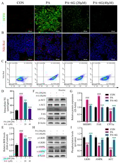 Nile red staining showed that 6-gingerol significantly inhibited the lipid accumulation in PA-treated HepG2 cells (Figure 6B), which was correspondingly evidenced by a flow cytometry analysis (Figure 6C). Furthermore, the PA-induced elevated intracellular TG level was significantly decreased by 6-gingerol (Figure 6D). As shown in (Figure 6A,E), PA-elevated intracellular ROS accumulation was significantly decreased by 6-gingerol. Consistent with the results in vivo, after treatment with 6-gingerol, the protein expressions of SREBP1, ACC and FAS were significantly suppressed, and the protein expressions of p-ACC and CPT1α were obviously promoted (Figure 6F). Moreover, the phosphorylation levels of LKB1, AMPK and ACC were all significantly increased by 6-gingerol (Figure 6H,I). Collectively, these data indicate that 6-gingerol alleviates the PA-induced intracellular accumulation of lipid and ROS, and activates the LKB1/AMPK pathway cascade in vitro.