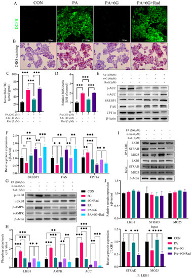 2.7. Radicicol Reverses the Alleviation of 6-Gingerol on PA-Induced Intracellular Accumulation of Lipid and ROS via Blocking the Enhancing Effect of 6-Gingerol on LKB1/STRAD/MO25 Complex Stability