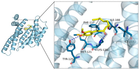 The docking calculation result, with the side chains of the residues around the binding pocket set as rigid, shows that 6-gingerol can bind inside the pocket and form hydrogen bonds with Tyr125 and Lys120 with docking energy less than or equal to −5.2 kcal/mol (Figure 8). The predictable interaction between 6-gingerol and LKB1 might be related to the binding activity of LKB1 to STRAD and MO25.