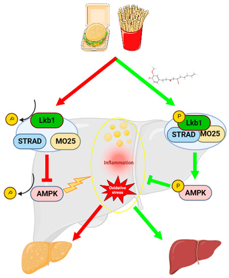 Liver kinase B1 (LKB1, also known as Stk11), one of the main upstream kinases of AMPK, was also the first to be identified. LKB1 forms a heterotrimeric complex with two regulatory proteins termed STE20-related adaptor (STRAD, an inactive pseudo-kinase) and MO25 (an armadillo-repeat scaffolding-like protein). The formation of the LKB1/STRAD/MO25 complex contributes to the cytoplasmic anchoring of LKB1, and thereby activates itself to increase its catalytic activity [12,13]. Activated LKB1 phosphorylates AMPKα at the Thr172 site to activate AMPK. The phosphorylation levels of LKB1 and AMPK were significantly decreased in high-fat diet (HFD) fed mice [14]. Previous studies have demonstrated that some compounds mitigate against NAFLD via the LKB1/AMPK pathway [15,16].