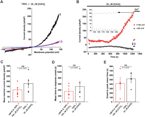 Activation of expressed TRPL channels by intracellular OAG. (A) Representative i-V curves obtained from patch clamp whole cell current measurements from a T-REx-293 cell expressing dTRPLWT and GFP, in response to voltage ramps from −150 mV to +150 mV, during continuous intracellular application of 30 μM OAG, a short time (red, 1) and long time (black, 2) after whole cell formation and after application of E1, SES with 10 mM Gd3+ at the end of the experiment (blue, 3). (B) Corresponding currents at +140 mV and −140 mV. Numbers indicate the time of the selected i-V curves. The top red dot circled in black represents 13 superimposed dots, each at a time point of 5 s after the previous dot. Inset, an enlarged segment of the corresponding currents, from 1150 s to 1200 s, indicating no significant change in current density. (C) A bar chart showing the mean maximal current density measured at +140 mV after the bath application of 100 μM CCh in T-REx-293 cells expressing dTRPLWT, GFP and hM1R (red, n = 6, see Figure 1D,E). The bar chart also shows mean maximal current density measured at +140 mV after intracellular application of 30 μM OAG via the patch clamp pipette in cells expressing dTRPLWT and GFP (black, n = 5, see Figure 3B). Error bars show SEM. p values were calculated using a two-tailed Mann–Whitney U-test and are indicated below the bars. Values from individual experiments are shown for each of the columns (circles). (D) A bar chart showing the mean time to response-onset measured after bath application of 100 μM CCh in T-REx-293 cells expressing dTRPLWT, GFP and hM1R (red, n = 6, see Figure 2B) or after whole cell formation with a pipette containing 30 μM OAG (intracellular application) in cells expressing dTRPLWT and GFP (black, n = 5, see Figure 4B). Values from individual experiments are shown for each of the columns (circles). (E) A bar chart showing the time from the response onset to the maximal measured current (when no significant change in the i-V curve amplitude was observed during 50 s) in the same cell types as in the bar chart described in D. Error bars show SEM. p value was calculated using a two-tailed Mann–Whitney U-test and is indicated below the bar. Values from individual experiments are shown for each of the columns (circles).