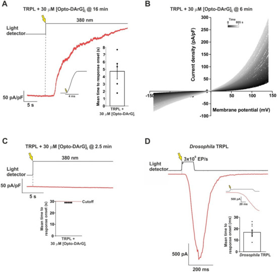 To use OptoDArG in our experiments, we included 30 μM OptoDArG in the intracellular solution of the recording patch clamp pipette. After the formation of the whole cell configuration, we waited >10 min in the dark to allow for the diffusion of the inactive OptoDArG and its accumulation in the surface membrane of the recorded HEK cell. Then, we set the membrane voltage of the recorded cell to +100 mV, to enhance the TRPL-dependent current as a function of time. To confirm that the trans OptoDArG is functionally inert, we waited an additional ~30 s at +100 mV and observed no change in current, as previously found for the basal conductance in TRPC3-expressing cells [27]. After the fast opening of an electronic shutter (rise time ~4 ms, Figure 3A, inset) that illuminated the recorded cell with an intense UV (380 nm) light, a relatively fast (average time to response onset ~4.5 s, Figure 3A, bar chart in inset) outward current was observed as a function of time (Figure 3A). Evidence that this UV-induced current reflects the activation of the expressed TRPL channels came from measurements of a family of i-V curves from cells that were kept in the dark only ~6 min before UV illumination. HEK cells in which we waited only a few min (<6 min) in the dark before the application of the UV light revealed i-V curves with amplitudes that increased with time (Figure 3B). We hypothesize that the increasing amplitudes of the i-V curves with time (Figure 3B) reflect the accumulation of active OptoDArG in the surface membrane of the recorded cell. The observed outward rectification and ~0 mV reversal potential of the i-V curves after UV illumination supports the identification of this current as a TRPL-dependent current. The application of the intense UV light to un-transfected HEK cells or to TRPL expressing cells with OptoDArG in the recording pipette, which were illuminated after a short (<3 min) dark interval after whole cell formation, did not elicit the above current (Figure 3C). These experiments indicated that similar to the inclusion of OAG in the recording pipette (Figure 2B,D), the inclusion of inactive OptoDArG in the recording pipette requires >10 min to accumulate in the surface membrane of the cells to allow the induction of large currents by UV light. Strikingly, photo-activation of the accumulated OptoDArG in the surface membrane dramatically accelerated the kinetics of TRPL-dependent current formation ~100-fold relative to OAG (Figure 2D). Nevertheless, the ~5 s delay in TRPL current activation by OptoDArG (Figure 3A) is still more than two orders of magnitude slower than the latency of TRPL activation in Drosophila photoreceptors by light (Figure 3D).