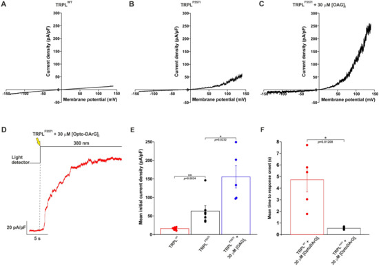A random chemically induced mutations screen in Drosophila caused several mutations in the TRP open reading frame, leading to fast retinal degeneration [1]. In later studies, it was found that the one critical missense mutation causing retinal degeneration was the F550I mutation. Interestingly, in the retinal degeneration mutant designated trpP365, the F550I pore-region mutation also gave rise to robust constitutively active channels [30,31]. This mutation induced cell death, most likely due to constant calcium influx through the open TRP channel [32,33]. In the present study, we exploited the F550 site of TRP that is conserved in TRPL [34]. Indeed, the homologue F557I mutation in the pore-region of TRPL also caused constitutive (but mild) activity of the mutant TRPL channel expressed in HEK cells when compared to the wild type (WT) channel (Figure 4A,B,E). Thus, the constitutive TRPLF557I-dependent current is rather small when compared to the equivalent current observed in the TRPF550I of the trpP365 Drosophila mutant [31], but it is still significant relative to the control (Figure 4E, black vs. red). Since the F557 site residing in the pore region of TRPL [34] and DAG was suggested to operate in the pore region of the TRPC3 channel [27], we attempted to search for a possible interaction between OAG and the F557I mutation of TRPL. To this end, we applied OAG into the whole-cell recording pipette and recorded the TRPLF557I dependent current. Strikingly, a large increase in the constitutive TRPLF557I dependent current was observed in these cells when 30 μM OAG was introduced into the intracellular solution (Figure 4C,E) shortly (<18 ± 1.2 s) after whole cell formation. Interestingly, the enhanced amplitude of OAG-induced i-V curves of the TRPLF557I mutant declined with time to low levels due to an unknown reason. Technically, 18 ± 1.2 s represents the fastest average time point that we were able to achieve from whole cell formation to the recording onset. Therefore, we thought of using OptoDArG to examine the exact time for TRPLF557I channel activation by the DAG analogue. When we performed the same activation protocol for OptoDArG detailed in Section 2.3 on cells expressing the TRPLF557I mutant channel, we observed a significant reduction in the time from the UV light application to the time of the response onset (mean time to response onset, Figure 4D) when compared to cells expressing the wild type TRPL channel (Figure 4F). Importantly, this mean time to response onset (542 ± 49 ms) of the TRPLF557I is similar to that observed for the WT TRPC3 channel [27] (see Section 3).