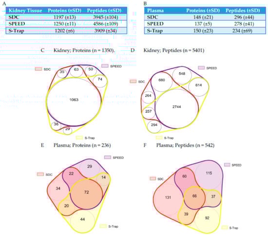 Summary tables (A) and proportional Venn diagrams (B) indicating the number of (C) proteins and (D) proteins quantified in kidney tissue, and number of (E) proteins and (F) peptides quantified in plasma by each preparation method using SWATH-MS. Areas of overlap indicate proteins/peptides quantified in SWATH by more than one preparation method.