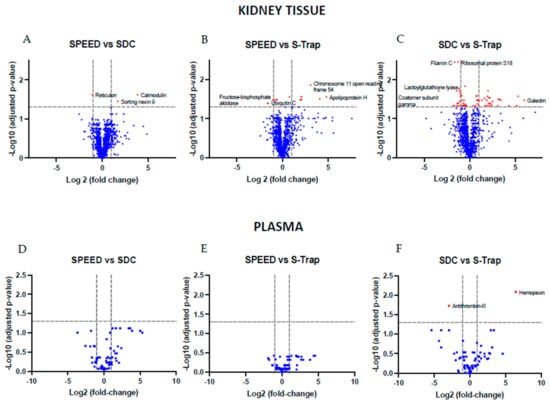 Volcano plots displaying false discovery rate adjusted p-values and fold-changes in SWATH protein intensity between methods in kidney tissue (A–C) and plasma (D–F). Proteins displayed in red represent those meeting the threshold for differential quantification (a fold-change with an adjusted p-value ≤ 0.05); the horizontal grey dashed line represents p(adjusted) = 0.05. The vertical grey dashed line represents a fold-change of two. In (A,B,D,E), protein fold-changes for SDC and S-Trap, respectively, are in reference to SPEED. In (C,F), protein fold-changes in S-Trap are with reference to SDC.