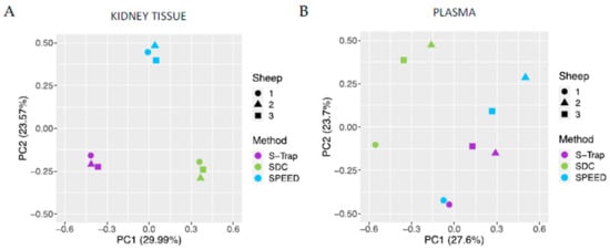 Principal component analysis (PCA) of the protein intensity data in kidney tissue produced three distinct clusters revealing that the sample preparation method, rather than the biological specimen (individual sheep), was the leading cause of variation between the samples (Figure 3A). In plasma, the PCA of the protein intensity data produced less distinct clusters of samples, indicating greater variability in protein intensity that may be influenced by other factors, including the complexity of the composition of plasma and biological variability between the individuals, in addition to the sample preparation method (Figure 3B). However, there is distinct segregation in Component 1 between the SDC method (shown in green) from the other two methods, indicating that the variability in this component may be due to the performance of the sample preparation method.