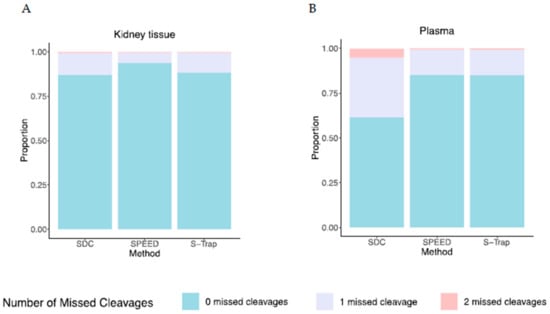 Trypsinization efficiency across preparation methods. The proportion of total detected peptides with missed cleavages for samples prepared using the SDC, SPEED, and S-Trap methods in (A) kidney cortical tissue and (B) plasma. Proportions displayed are the mean across three biological samples.