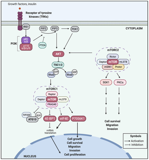 In summary, the PI3K/AKT/mTOR pathway activation requires the function of mTORC1 and mTORC2 complexes to integrate extra- and intracellular signals in order to promote protein synthesis, cell metabolism, growth, cell proliferation, apoptosis evasion, migration, invasion, and other features [38,39,40]. The normal function of this axis can be disrupted by genetic and epigenetic alterations that, in general, are able to induce an increased pathway activity in abnormal cells, leading to several types of diseases, such as cancer [41].