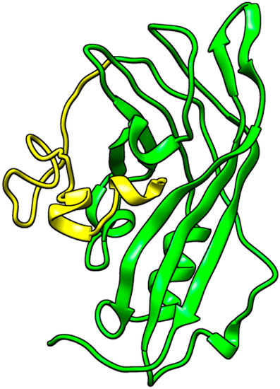 Structure of the selected VP40 NTD model generated via I-TASSER using 1ES6’s structure as template. Image was generated using UCSF Chimera version 1.16 [45]. Regions colored yellow represent missing residues that were remodeled.