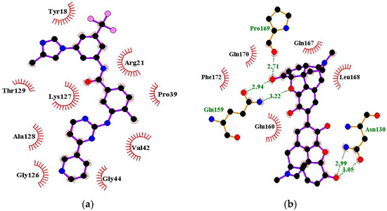 Protein–ligand interaction map of VP40 in complex with (a) nilotinib and (b) ZINC000085531689. The green, dotted lines indicate hydrogen bonds while the red arcs with spikes represent hydrophobic interactions.