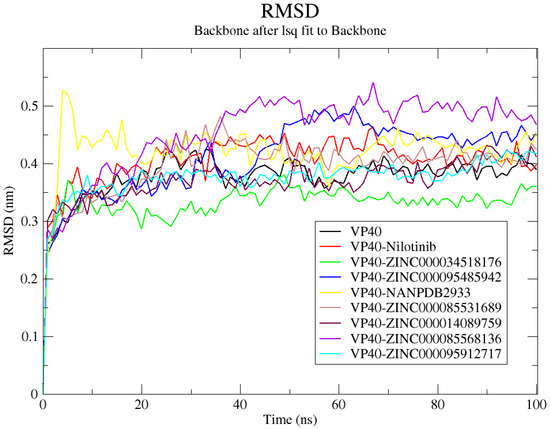 MD simulations are used not only to explore the conformational aspects of biological systems but also to obtain a significant scope with which to analyze protein–ligand interactions. A 100 ns MD simulation was performed to investigate the dynamic behavior of the lead complexes. The simulation was conducted for the unbound protein (VP40), nilotinib, and seven potential lead compounds complexed with VP40.
