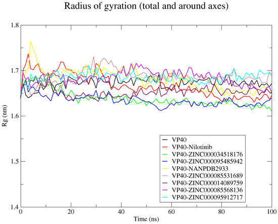 The compactness of the complexes was assessed by analyzing the radius of gyration (Figure 5). A steady radius of gyration throughout a simulation period indicates a stably folded protein [162]. The Rg for the unbound protein was relatively steady over the simulation period, corresponding to an average of 1.67 ± 0.01 nm (Figure 5). All the VP40–ligand complexes had Rg values comparable to that of the unbound protein. The VP40–nilotinib, VP40–ZINC000014089759, VP40–ZINC000034518176, and VP40–ZINC000095485942 complexes had average Rg values lower than that of the unbound VP40, presenting values of 1.668 ± 0.025, 1.653 ± 0.01, 1.638 ± 0.018, and 1.635 ± 0.012 nm, respectively (Figure 5). The VP40–ZINC000085568136, VP40–ZINC000085531689, VP40–ZINC000095912717, and VP40–NANPDB2933 complexes exhibited comparable Rg scores, presenting average values of 1.683 ± 0.015, 1.685 ± 0.016, 1.685 ± 0.01, and 1.681 ± 0.023 nm, respectively (Figure 5).