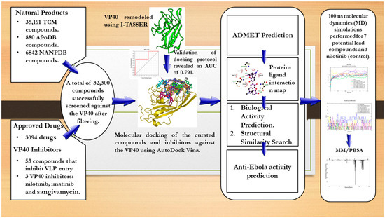 Pharmacoinformatics-based techniques were employed to identify potential VP40 inhibitors from natural-product-derived compounds curated from African and Chinese sources (Figure 7) as performed in a previous study [213]. Approved drugs from various institutions were also obtained and screened (Figure 7). The study used structure-based virtual screening coupled with MD simulations and molecular mechanics Poisson–Boltzmann surface area (MM/PBSA) analyses to propose compounds with plausible binding affinity and mechanisms of binding. The shortlisted compounds were subjected to safety and toxicity profiling to further shortlist those with insignificant toxicity concerns. The biological activity and anti-EBOV activity of the shortlisted compounds were also determined.