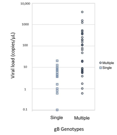 - Aquino, V.H.; Figueiredo, L.T. High prevalence of renal transplant recipients infected with more than one cytomegalovirus glycoprotein B genotype. J. Med. Virol. 2000, 61, 138–142. [Google Scholar] [CrossRef]