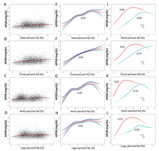 The correlation between ApoB and total percent fat, trunk percent fat, arms percent fat and legs percent fat. (A–D), black dots indicate the distribution of individual values. (E–H), red line shows the smooth curve fitting of the variables, and the area between the two blue lines represents 95% of the confidence interval (CI). (I–L), smooth curve fitting of variables stratified by gender (red line for male, blue line for female). Age, gender, race, hypertension, diabetes, hyperlipidemia, coronary heart disease, smoking status and vigorous work activity were adjusted. (I–L) were not adjusted by gender.