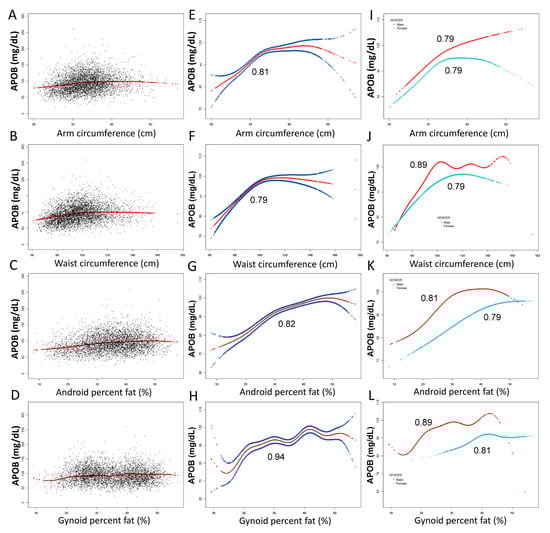 The correlation between ApoB and arm circumference, waist circumference, android percent fat and gynoid percent fat. (A–D), black dots indicate the distribution of individual values. (E–H), red line shows the smooth curve fitting of the variables, and the area between the two blue lines represents 95% of the confidence interval (CI). (I–L), smooth curve fitting of variables stratified by gender (red line for male, blue line for female). Age, gender, race, hypertension, diabetes, hyperlipidemia, coronary heart disease, smoking status and vigorous work activity were adjusted. (I–L) were not adjusted by gender.