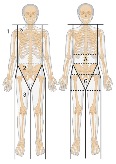 Fat distribution regions measured by dual-energy x-ray absorptiometry. 1. arm fat region; 2. trunk fat region; 3. leg fat region; A. android region; G. gynoid region. Created with Biorender.com.