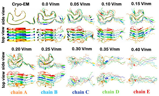 The last snapshots of α-synuclein pentamers which were extracted from the 600 ns MD trajectory. The side and top view show conformational changes on α-synuclein under the influence of 0.05, 0.10, 0.15, 0.20, 0.25, 0.30, 035, and 0.40 V/nm electric field.