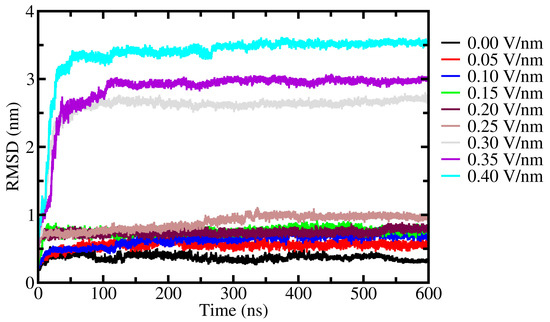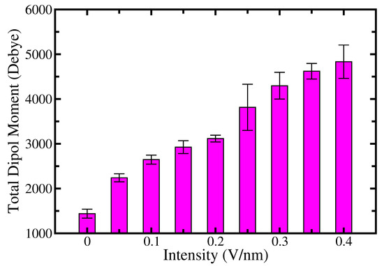It is worth mentioning that each type of protein maintains a certain value of a dipole moment due to the presence of charged side chains [56,57]. The value of a total dipole moment can serve as one of the indicators that show conformational changes on the protein, i.e., its folded or denaturated state. An increase in total dipole moments in comparison to the native state of the protein is associated with conformational transitions towards to the denaturation state. Therefore, we also calculated the total dipole moments of the pentamer for each case of applied EF and the average over the all replicas (see Figure 3).