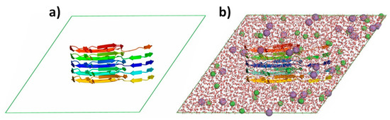The representation of the initial state of the model system. (a) α-synuclein pentamer is placed in the center of the dodecahedron box (represented in cartoon view—rainbow color). (b) The simulation box filled with water molecules (represented in licorice view) and sodium and chloride ions (shown as violet and green beads).