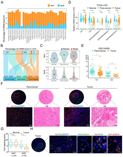 We also performed fluorescence in situ hybridization (FISH) tests on a tissue microarray (TMA) consisting of 180 pairs of para-cancer and tumor tissues from patients with liver cancer and detected a significant decrease in Iso2 in tumor tissues (Figure 1F,G). Similar to the RNA-seq results from the public cohorts, the FISH-staining pattern of Iso2 was also highly heterogeneous among patients. Strong Iso2 staining was only observed in a few patients and in most tumor tissues, Iso2 was undetectable. Although the expression trends of Iso1 were inconsistent among two public datasets and the FISH results, Iso1 and Iso2 conferred different expression patterns, suggesting their different roles in tumor progression (Figure 1F,G). Meanwhile, FISH data also showed the co-expression of Iso2 and Iso1 in most para-cancer parenchyma cells and tumor cells (Figure 1H and Figure S1A), suggesting that there might be functional interplays between Iso1 and Iso2. Despite the dominated location in parenchyma cells and tumor cells, co-expression of these two isoforms could also be observed in some tumor-associated cells with nontumorous morphology. Meanwhile, an immune analysis of TCGA data using different tools revealed that level changes of Iso1 and Iso2 in tumor tissues were significantly associated with the numbers of macrophages and M2-type macrophages (Supplementary Figure S1A–C), suggesting Iso1 and Iso2 might also function in macrophages.