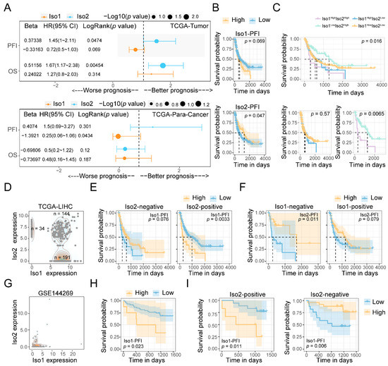 Based on the cut-off point in each Kaplan–Meier analysis, we divided all patients into Iso1high Iso2high, Iso1high Iso2low, Iso1low Iso2high and Iso1low Iso2low groups and observed the significant prognostic difference in PFI among all these groups (p = 0.016) (Figure 2C). Intriguingly, patients in the Iso1lowIso2high group had the longest median survival time, while those in Iso1highIso2high group had the shortest. A significant prognostic difference was only observed between these two Iso2high groups (p = 0.0065) instead of the other two Iso2low groups (p = 0.57) (Figure 2C), indicating that the tumor-promoting effects of Iso1 depended on the upregulation of Iso2.
