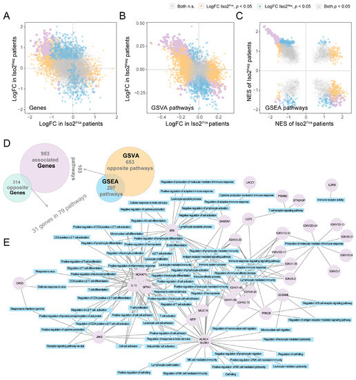 Changed or reversed functions of Iso1 under the expression switch of Iso2 from positive to negative. (A–C) Genes, GSVA and GSEA pathways significantly associated with Iso1 in Iso2Pos and Iso2Neg patients. (D,E) Intersected DEGs and pathways from the aforementioned analysis.