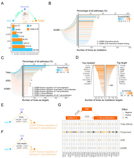 To clarify the importance and the universality of these downstream factors, we calculated their frequency detected as mediators or targets in the mediations with significant ACMEs. The immune-related mediator pathway with the top frequency was cytokine activity, and the top target pathway was the positive regulation of active T cell proliferation, indicating that Iso2 was capable of promoting T cell proliferation by changing cytokines activity (Figure 5B,C). Meanwhile, the immune-related mediator gene with the highest frequency was TNF (Top9) and the target gene was CD3D (Top3). Since CD3 is the pan-marker of T cells, the mediation results of pathways and genes indicated that Iso2 increased the number of CD3+ T cells by promoting the proliferation of T cells, which is mediated by the levels and the activity of TNF (Figure 5D). We also verified the significant regulation axis of Iso2-TNF-T cell proliferation in both TCGA-LIHC and Mongolia liver cancer cohorts (Figure 5E,F). Moreover, this axis with significant ACME and total effects could be observed in other cancer types in TCGA data, including BRCA, BLCA, ESCA, HNSC, LGG, LUAD, SARC, SKCM, STAD, TGCT and THCA (Figure 5G), indicating that the proliferation of T cells is a universal immune-related downstream function of Iso2.
