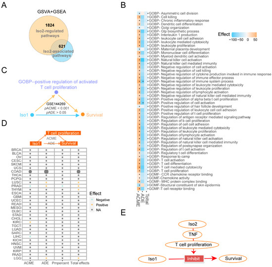 Dependency of the downstream immune pathways of Iso2 for the prognosis effect of Iso1. (A)Venn diagram of the intersection between the downstream immune pathways of Iso2 and the key Iso1-associated pathways changed or reversed under expressional switch of Iso2. (B–D) The mediating effects of T cell proliferation on the prognostic effects of Iso1 determined by causal mediation analysis in the Mongolian liver cancer cohort and different TCGA sub-cohorts (E) The prognosis promotion effect relies on the Iso2-TNF-T cell proliferation axis.
