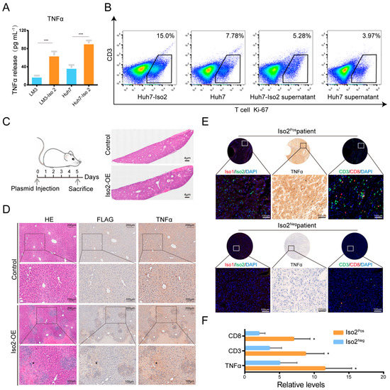 The regulation of Iso2 on TNF-α expression and T cell numbers verified by in vitro and in vivo experiments. (A) Increased TNF-α in protein level induced by the overexpression of Iso2. (B) Ki-67 staining of T cells with the indictment. (C,D) The extent of damage, inflammatory infiltration and the elevation of TNF-α triggered by slightly overexpressed Iso2 in normal liver using the mouse model of hydrodynamic tail-vein injection. The representative data were determined by HE staining and IHC staining. (E,F) The co-expression and co-localization patterns of Iso2, TNF-α and CD3+/CD8+ T cells in a liver cancer tissue microarray. Data were presented as mean ± SD, * p < 0.05, *** p < 0.001.