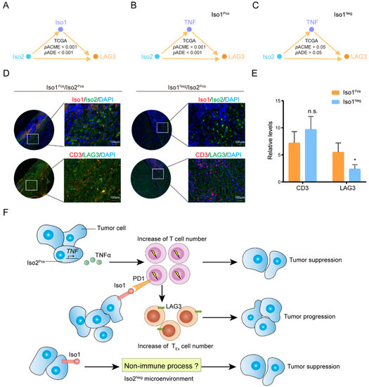 The roles of Iso1 in mediating the regulation of Iso2 on exhausted T cell. (A–C) The mediator analysis between LAG3 and Iso2. (D,E) The immunostaining of LAG3+CD3+ T cells in Iso1PosIso2Pos and Iso1NegIso2Pos tumors. Data were presented as mean ± SD, n.s.: not significant, * p < 0.05. (F) Highlights of the results.