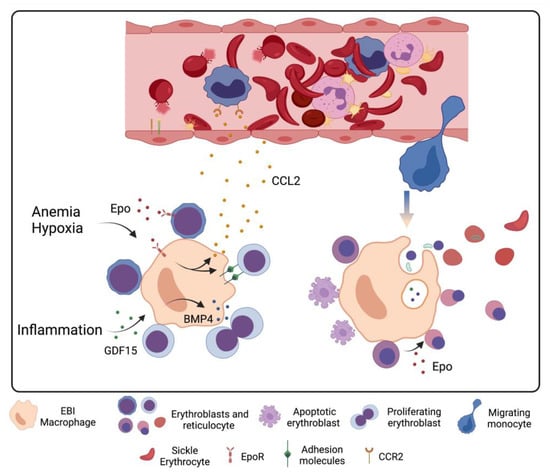 Additionally, upon stress and following Epo stimulation, splenic red pulp macrophages and hepatic Kupffer cells secrete the chemokine CCL2, which recruits CCR2+ circulating monocytes to the respective organs, where they differentiate into EBI macrophages. CCR2 KO mice showed a drop in monocyte recruitment to the spleen and liver and a consequent reduction in erythroid cell expansion [,], showing that the new EBI structures that are formed during stress are critical for supporting extramedullary erythropoiesis, at least in murine models.