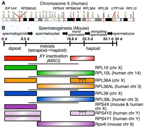 Two hundred million years ago, mammals developed the heterogametic system of sex determination using the X and Y chromosomes [67,68,69]. In females, this leads to issues of dosage compensation and embryonic inactivation of surplus X chromosomes [70]. Conversely, in male germ cells undergoing meiosis, the X and Y sex chromosomes cannot pair during synapsis. Thus, the sex chromosomes are shunted to a subnuclear region—the XY body—and transcriptionally silenced, a process known as meiotic sex chromosome inactivation (MSCI) [71,72,73]. When the protomammalian ancestor of the X chromosome diverged from avian chromosome 4 [74], it harbored several small and large RP genes and ribosomal accessory protein genes (Table 2) that are subject to MSCI during pachynema and often remain transcriptionally silent for the remainder of spermatogenesis [75]. MSCI inactivation of these RP genes resulted in a flowering of RP gene paralogs—usually retrotransposed copies—that are expressed during male meiosis [31,76]. Thus, post meiotic male germ cells have ribosomes that are specialized to take on spermatogenesis-specific functions.
