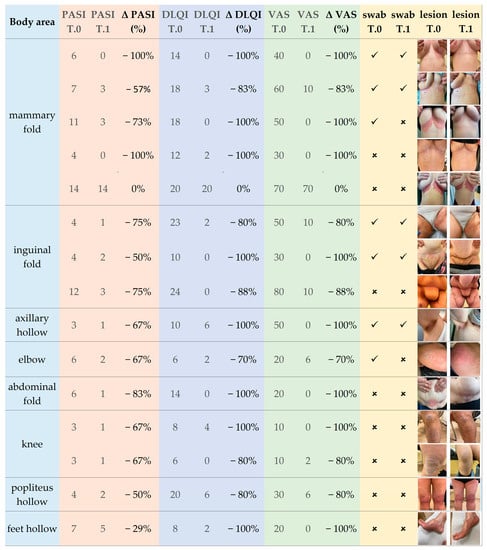 Clinical outcomes. In the first light-blue column, the body area sampled is indicated. The pink, blue, and green columns report the score and the percentage variation (Δ) of PASI, DLQI, and itch VAS indexes, respectively. In the yellow columns, the tick and cross symbols indicate whether the swab was collected or not collected.