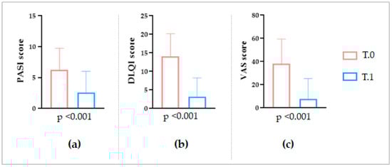 Statistical comparison between the (a) PASI, (b) DLQI, and (c) itch VAS scores registered before and after the LimpiAL treatment (Wilcoxon test, p ≤ 0.05).