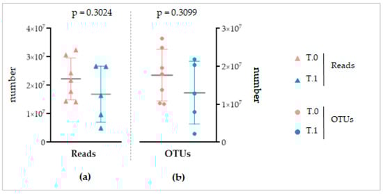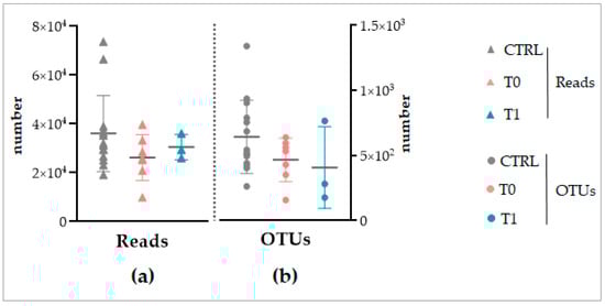 No significant difference was found between the reads number and the detected OTUs between the CTRL, T0, and T1 groups (Figure 3). The statistical comparison between groups was performed through the Kolmogorov–Smirnov test for not normally distributed series through the ANOVA analysis for normal distributions of values (Table S2).