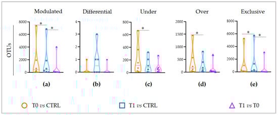 The modulation trends of OTUs in compared microbiota. The number of (a) modulated, (b) differential, (c) under and (d) over-represented, and (e) exclusive OTUs is reported with respect to each compared microbiota. The orange and blue colors indicate the OTUs of T0 and T1 microbiota compared to the CTRL ones. The violet color depicts the OTUs varied in the T1 microbiota with respect to the T0 microbiota. The asterisk indicates the statistical significance of comparisons, with * standing for p < 0.05.