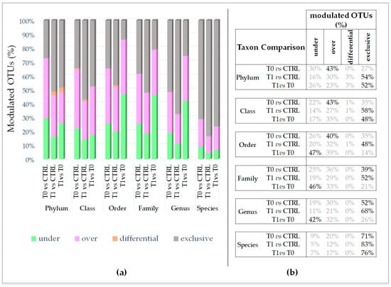 The percentage distribution of differential, over, under, and exclusive OTUs of all interesting comparisons (T0 vs. CTRL, T1 vs. CTRL, and T1 vs. T0) was calculated along all taxonomic levels. The more represented category of OTUs among the ones listed before (higher percentage) identified the prevalent type of modulation induced and the taxonomic level it acted predominantly on.