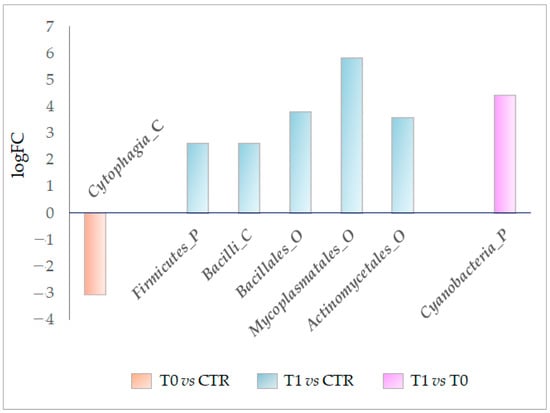 For the T1 microbiota, a significant increase of at least 2 logFC was verified for the Firmicutes phylum, the class of Bacilli, and orders of Bacillales, Mycoplasmatales, and Actinomycetales (Figure 6, Table S4). Finally, the Cyanobacteria phylum significantly increased in the T1 microbiota compared with the T0 microbiota (Figure 6, Table S4).