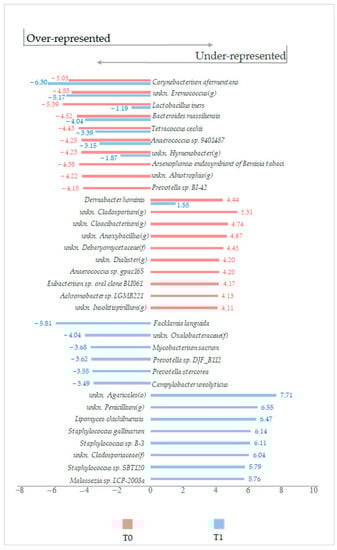Comparison between the modulation trends detected in T0 and T1 microbiota for the ten most under (bars to the left side) and ten most over (bars to the right side) modulated OTUs.