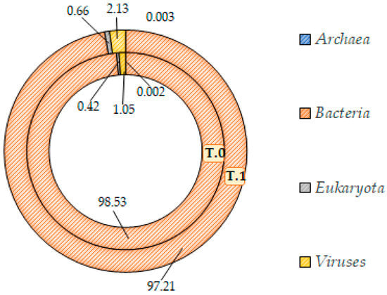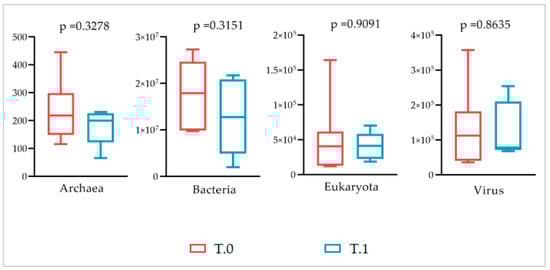 The statistical analysis confirmed that no significant difference was appreciable between the domain abundances of T.0 and T.1 microbiotas (unpaired Student’s t-test for normally distributed series and Kolmogorov–Smirnov test for not normally distributed, p > 0.05) (Figure 10).